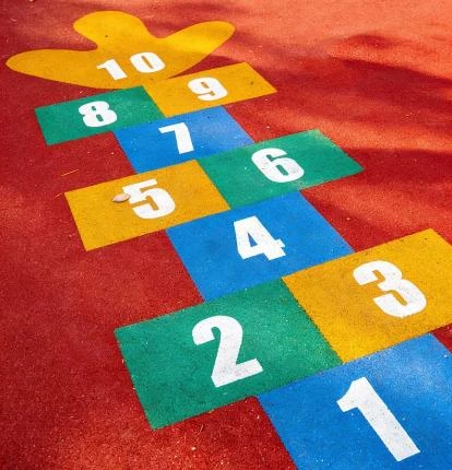 Traditional playground games are painted markings that define classic games such as hopscotch, skipping games, playground courts, and movement trails.